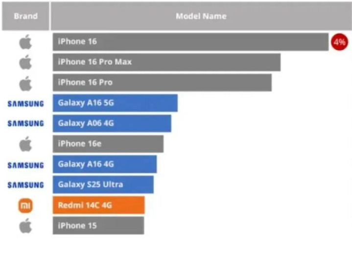 另外,苹果还有两款机型上榜,分别为 iPhone 16e,排名第六;标准版 iPhone 15,排名第十。
