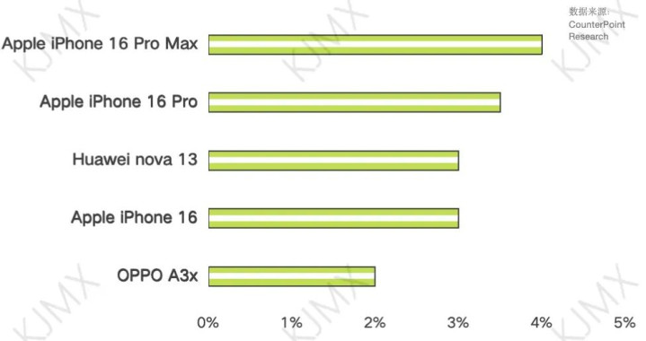 具体的排名为,苹果旗下iPhone 16 Pro Max以4%的市场份额占据榜首,紧随其后的是3%份额占比的苹果iPhone 16 Pro、华为nova13、苹果iPhone 16,OPPO A3x也以2%的份额跻身前五。